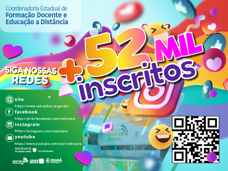 A Secretaria da Educação - Seduc/CE por meio da Coordenadoria Estadual de Formação Docente e Educação a Distância - Coded/CED, desenvolve diversas ações pedagógicas destinadas à formação continuada de profissionais da educação, como também para o fortalecimento do ensino e da aprendizagem dos estudantes das redes públicas estadual e municipal. Tais ações são realizadas em formato híbrido, ou seja, de forma presencial e/ou a distância. Como uma teia que conecta toda uma rede de ensino, a Coded/CED possui materiais que dialogam entre si, disseminam e fortalecem as políticas públicas educacionais. Para tanto, dispõe de plataformas virtuais que congregam os chamados Recursos Educacionais Abertos (REA), tais como: o site - https://www.ced.seduc.ce.gov.br/, o canal no YouTube - https://www.youtube.com/cedceara, e as redes sociais, Facebook - https://www.facebook.com/cedceara e Instagram - https://www.instagram.com/cedceara/. Todo o público é convidado para fazer parte dessa conectividade.